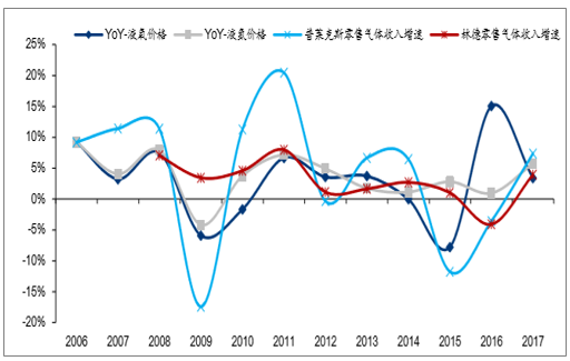 气体供应商的零售气体收入受量价两方面因素影响,弹性或大于区域价格弹性。由于区域零售气体价格对需求量敏感,而零售气体收入受到价和量两方面因素的影响,因此气体供应商的零售气体收入对需求量的敏感程度大于区域价格对需求量的敏感程度。普莱克斯克斯和林德气体的零售气体业务收入增速的变化与气体价格变化大致同方向,并呈现出更大幅度的变化。